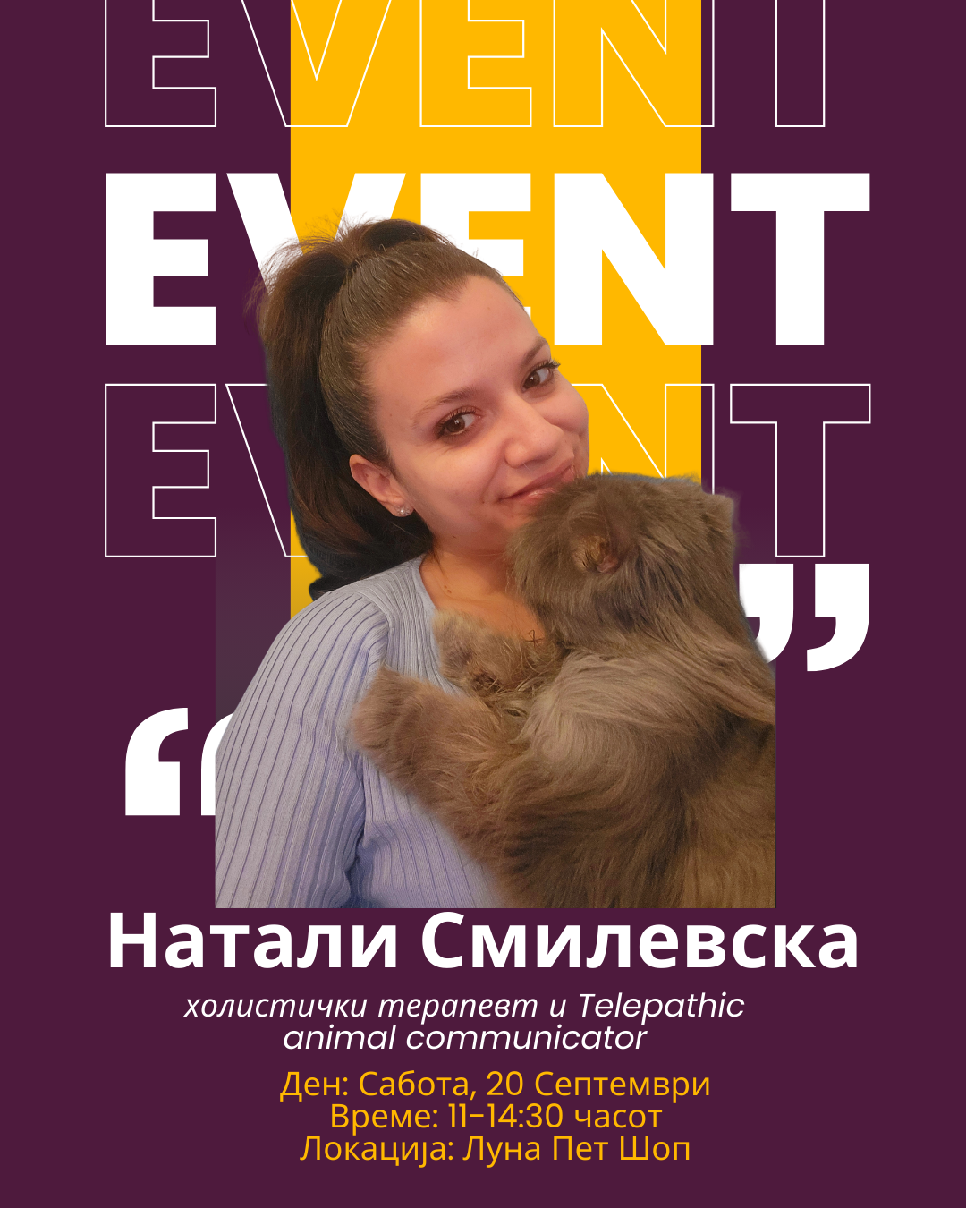 Затоа, доколку Вашето милениче има проблеми со анксиозност, страв или стрес поради одредени причини, во сабота на 20.09.2025 г. од 11.00-14.30 ч. Ве очекуваме во Луна Пет, каде таа со огромно задоволство ќе Ве советува како да се справите со проблемите на Вашите миленици.