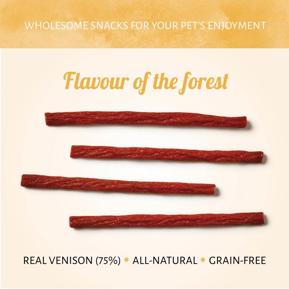 Здрави и вкусни награди во XXL пакување! Награди го твоето верно другарче со прекрасниот вкус на диво месо со нашите WILD стапчиња од еленско месо. Премиум месни закуски за кучиња, совршени за кучиња склони кон алергии. Овој лесно дигестивен протеин ќе го поддржи растот на мускулите на вашето куче и е богат со хранливи материи. Направено со само три состојки, тоа е тоа. Чисто и едноставно. Дозволете му на вашето куче да ужива во вкусот на шумата!